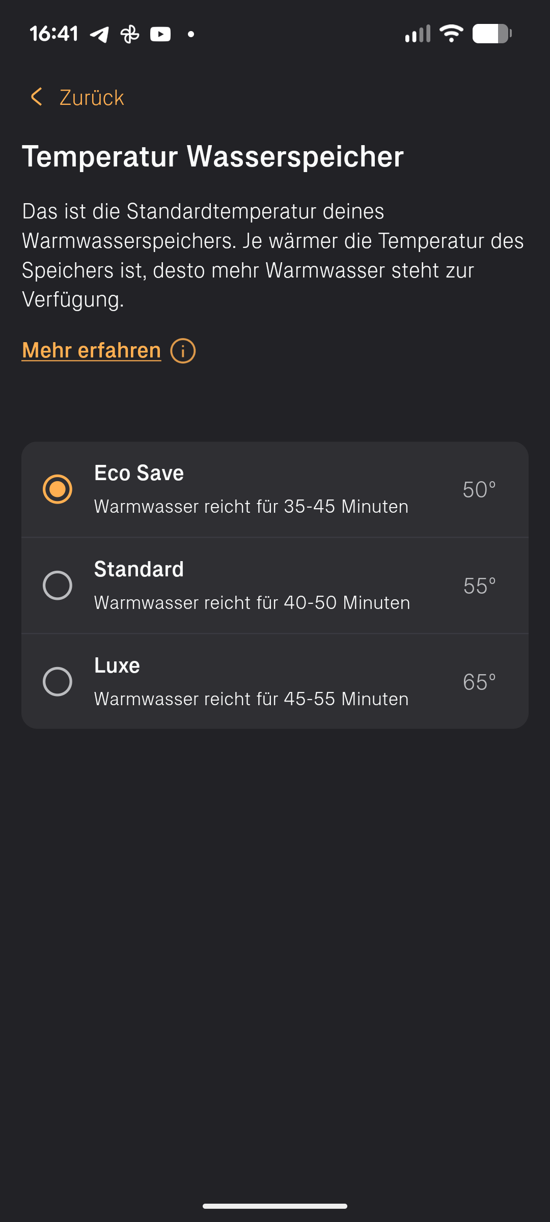 Mit der Angabe des aktuellen Stromtarifs verspricht die App weitere Einsparungen. Also gut.Ich hinterlege meinen Eprimo Tarif mit 0,30 € pro kWh.Festpreis. Rund um die Uhr. Die App verkündet mir nun noch intelligenter zu walten und stellt meinen Zeitplan wieder um auf "Intelligenz".